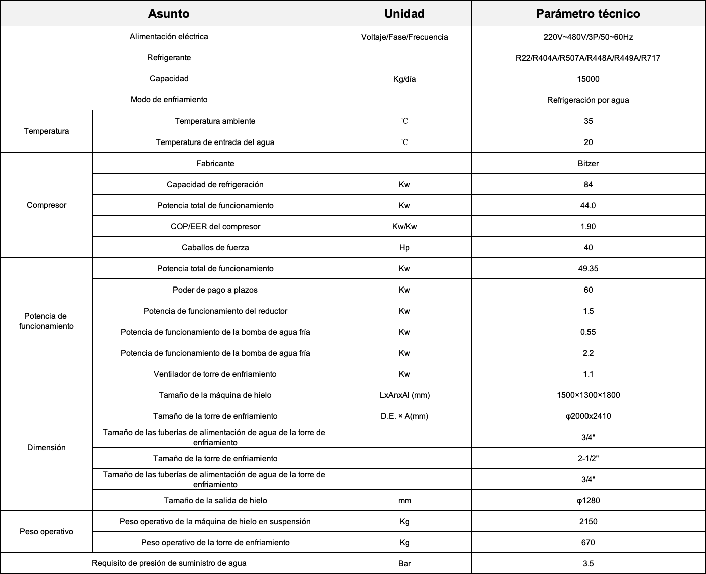 • Máquina de hielo en suspensión de 15 toneladas/día