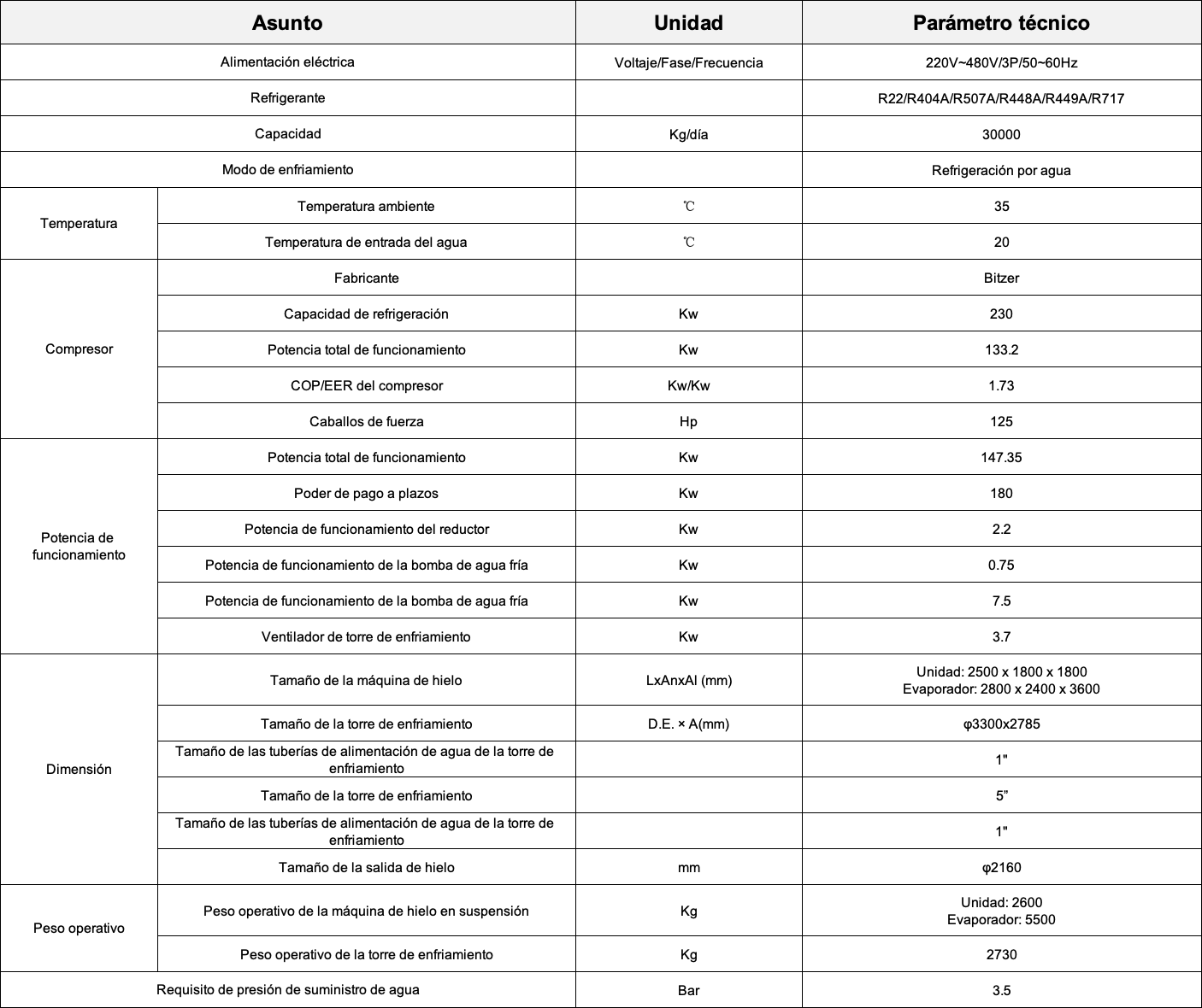 • Máquina de hielo en suspensión de 30 toneladas/día
